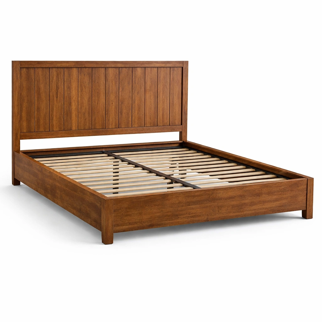 Estructura y diseño: Cabecero con tablas verticales integradas. Estructura con patas y somier laminado de madera.